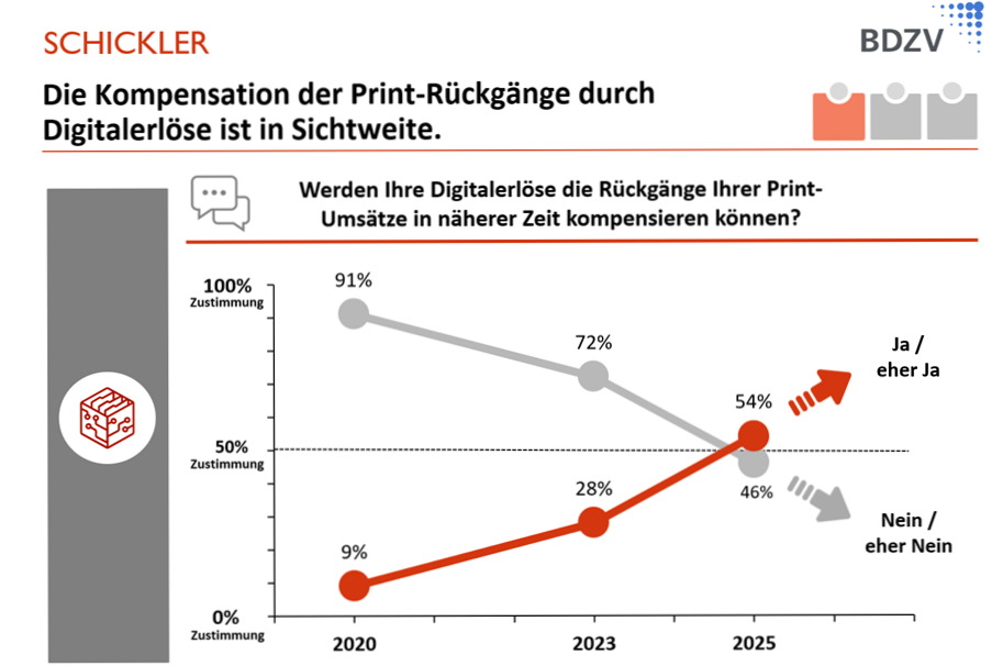 Dies ist ein Kernergebnis der BDZV/SCHICKLER Trendumfrage 2020. Dieser Wandel ist geprägt von Optimismus und Aufbruchsstimmung: Heute geht noch eine große Mehrheit der Top-Entscheider davon aus, dass das Wachstum der Digital-Erlöse den Rückgang der Print-Erlöse nicht kompensieren kann. Über die Hälfte (54%) sind aber überzeugt, dass dies ab 2025 der Fall sein wird.