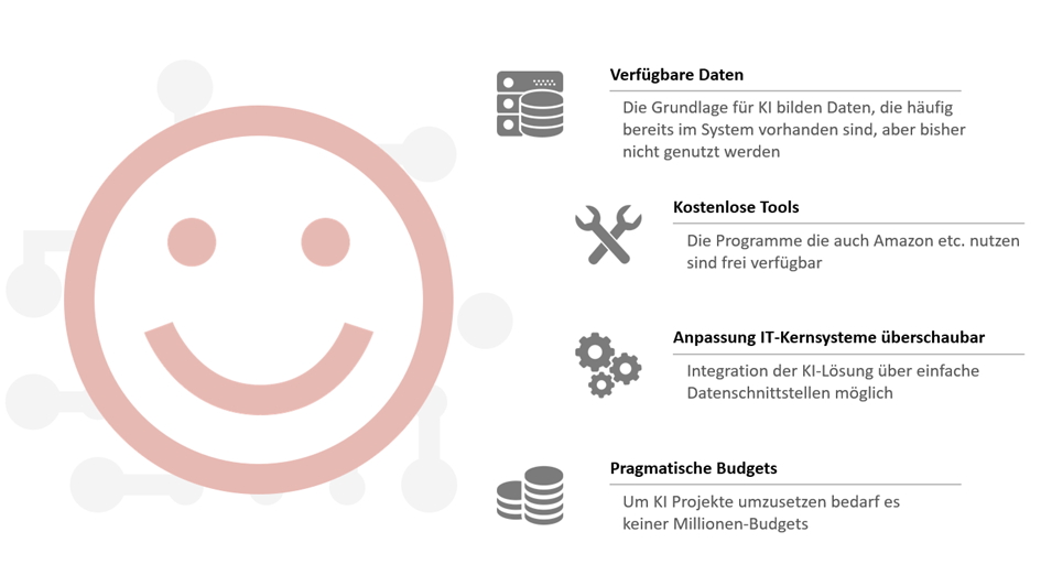 Für viele Unternehmen erscheint der Einsatz von Künstlicher Intelligenz außer Reichweite und die notwendigen Ressourcen nur für internationale Großkonzerne erreichbar – das Gegenteil ist der Fall. Die von Tech-Riesen genutzten Werkzeuge für Künstliche Intelligenz sind meist frei verfügbar. Voraussetzung für Erfolge sind die richtigen Daten und das Know-how.