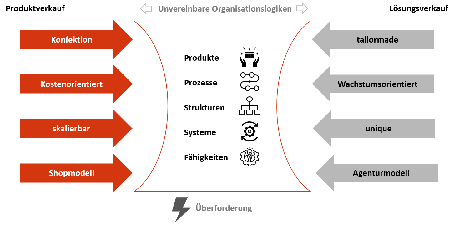 Bei der Transformation vom Produkt- zum Konzeptverkauf wird vielerorts der Fehler begangen, dass mit denselben Mitarbeitern in komplizierten Organisationsprozessen und mit überdimensionierten Systemen und Tools beide Modelle für alle Kunden gleichzeitig betrieben werden. Implizite Erwartung dabei ist, individuelle Kundenlösungen mit derselben Prozesseffizienz verkaufen und abwickeln zu können wie eine 1/1-Seite. Diese Erwartung führt zwangsläufig zu einer Überforderung.